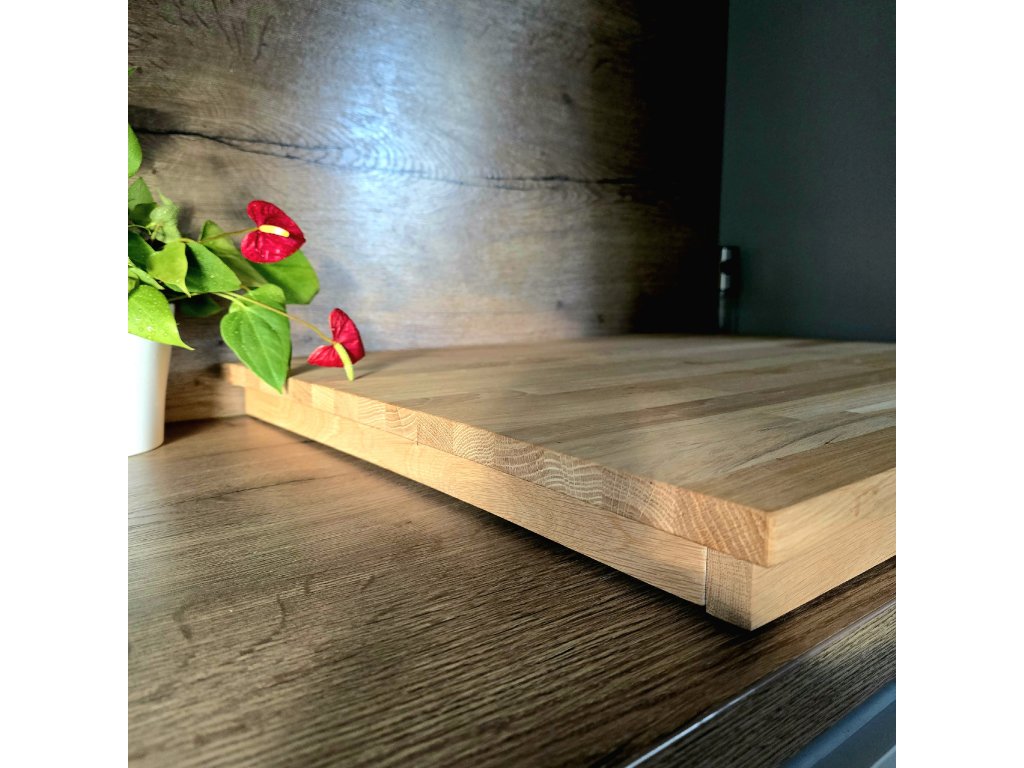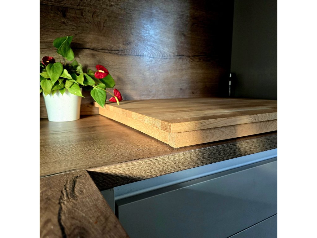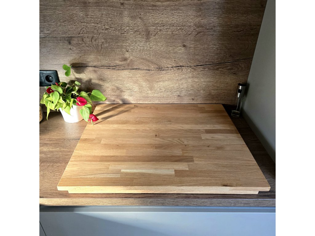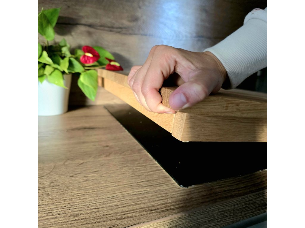 Kryt na desku z kvalitního dubového dřeva spojuje praktičnost, čistý design a kvalitu v jednom. Deska stojí na třech stranách, čtvrtá strana je volná pro snadný přístup vzduchu. Pro ochranu desky jsou zespodu nalepeny silikonové podložky. Pro co nejdelší životnost je deska ošetřena bezbarvým olejem na kuchyńská dřevěná prkénka značky Osmo. Podívejte se na naše videa, jak snadno se s ní manipuluje.